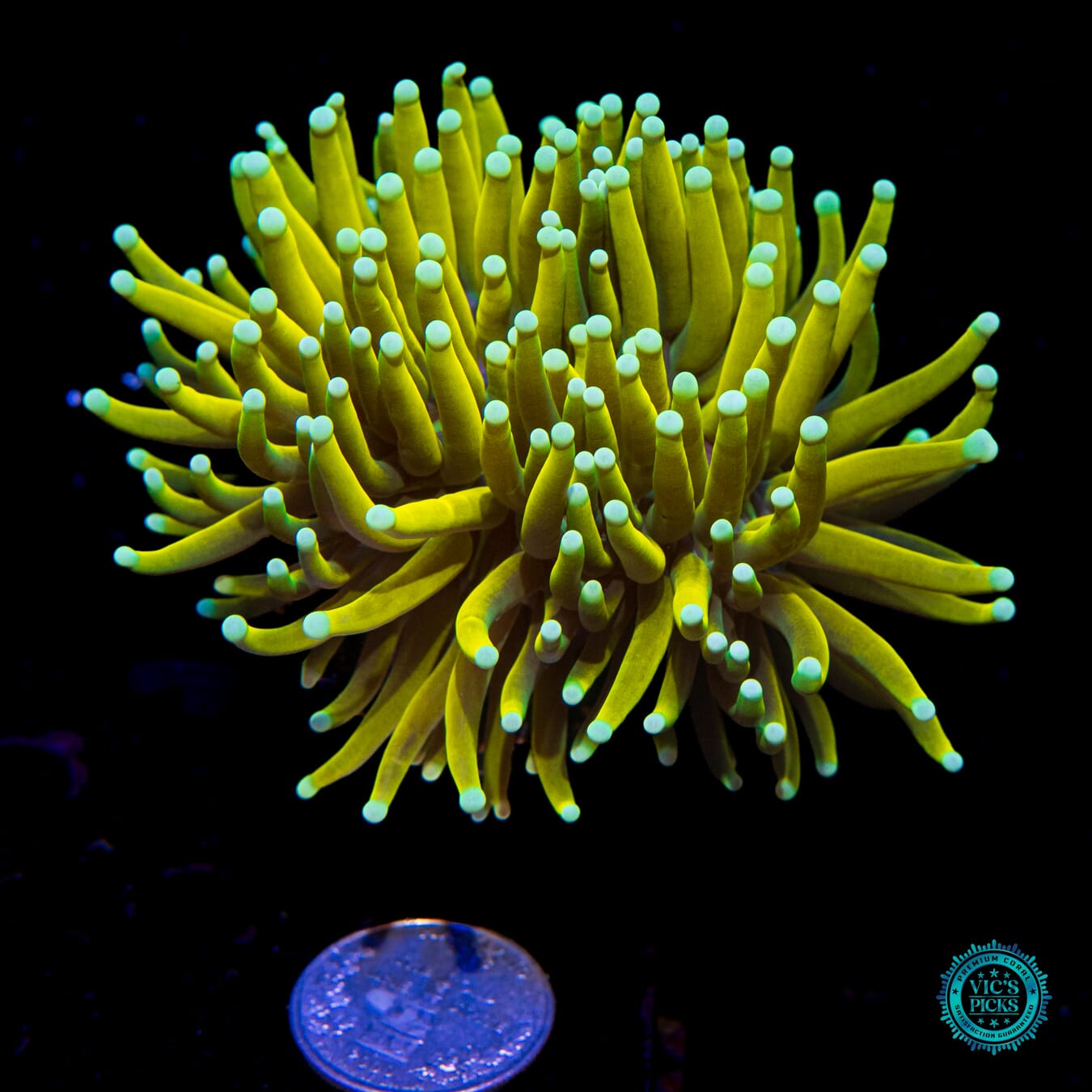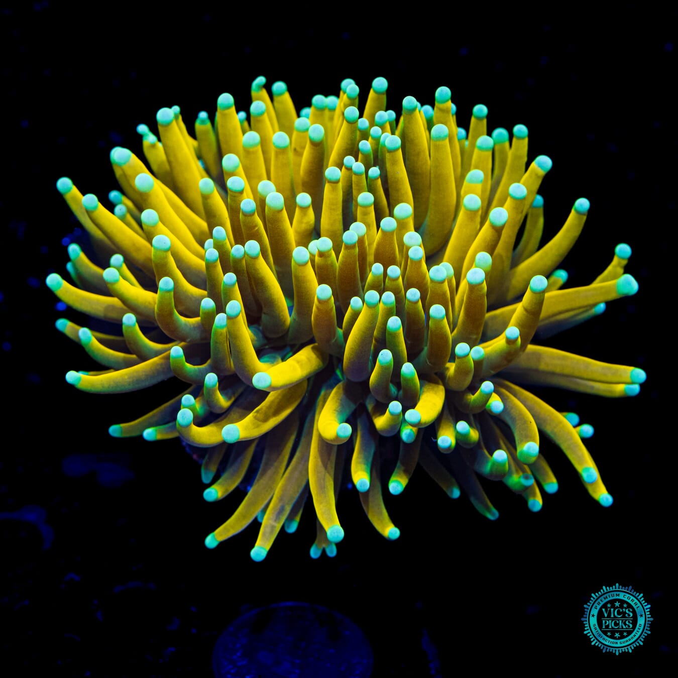 3.5" WYSIWYG and fully conditioned to life in a reef tank! Yellow is hard to come by in reef tanks. And this torch with it's golden yellow is pretty much perfect. It'll contrast amazingly well with those darker torches. What a fantastic Torch to start your Torch garden! Torch Corals do well in medium lighting, that said, don't place them in par over 175 or so as they can get burned. They also prefer an alternating low to medium-low flow. In regards to feeding, I would recommend target feeding it once a week with a high quality meaty frozen food to keep it fat, flowing and happy, lol. Keep in mind that Torch Corals will sting almost all other corals, so make sure to give them plenty of room. Frogspawn are the one exception. Hammers however, will be nuked and killed if placed too close.