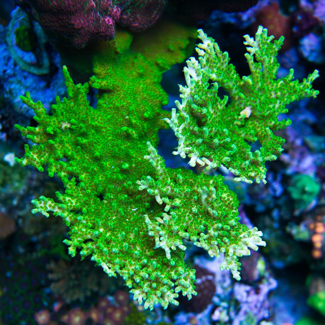 This Acro prefers intense lighting and solid flow to develop its signature flattened, horizontal shape. Over time, it creates layered plate-like structures that provide beautiful contrast against upright SPS.