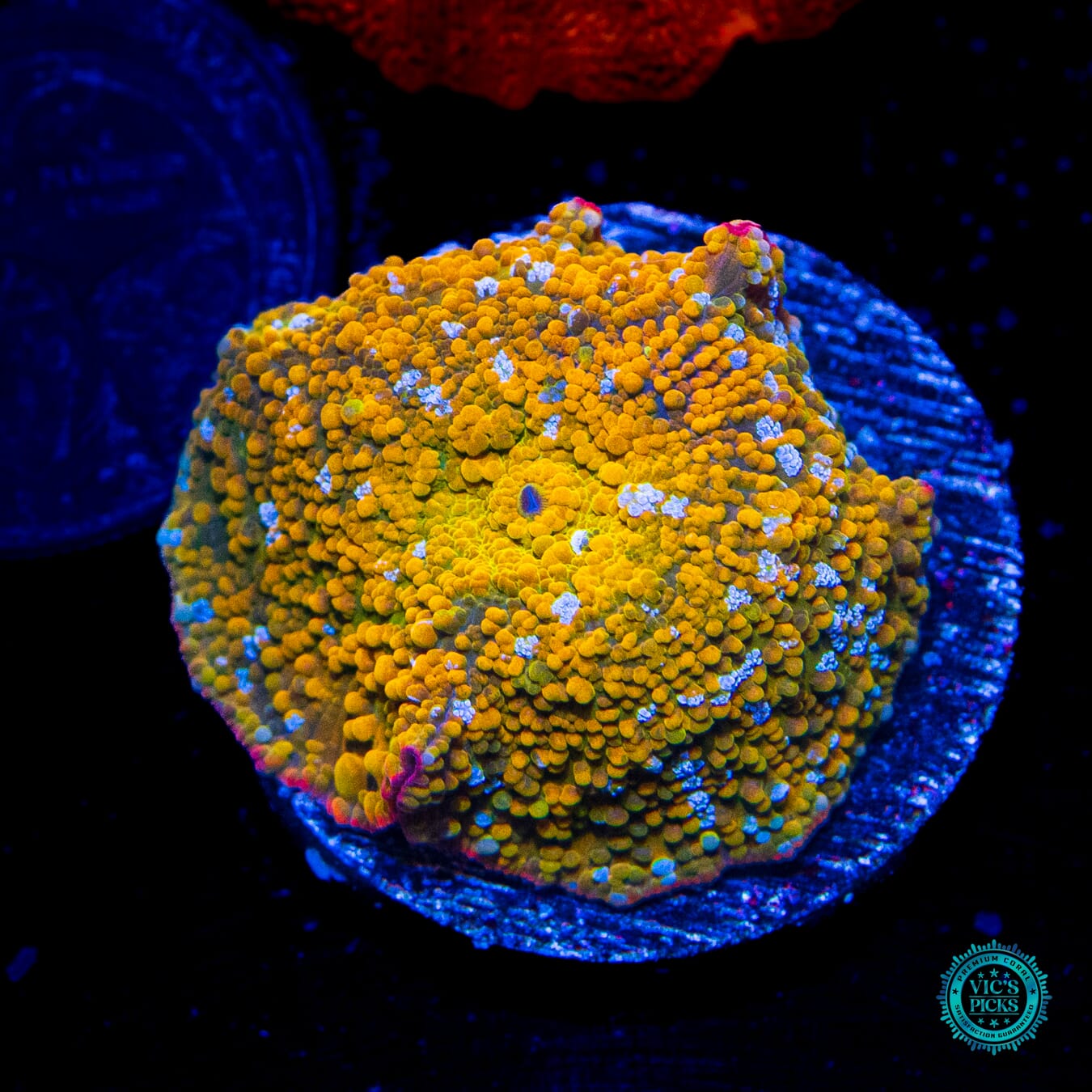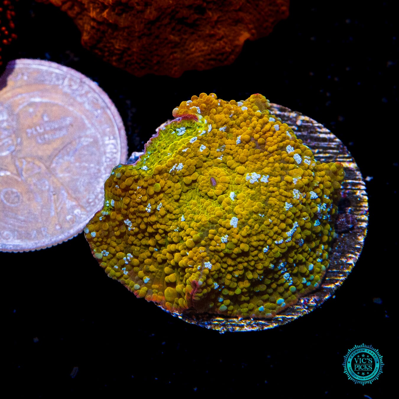 Make sure to place this mushroom low, like super low in your reef (less than 100 par), with low flow. We also recommend target feeding it once per week, and if you do you'll be overjoyed to see it start to grow more quickly and eventually bud off and spread out in all directions! The trick with feeding Mushroom Corals is to hold a piece of meaty food in place with a pair of tweezers until the Mushroom grabs a hold of the food. And once the mushroom grabs onto it you will then be able to watch the cool process of the mushroom slowly closing up around the piece of food. It’s awesome to watch! Just like everything in reefing, be patient and you will be amazed at what transpires!