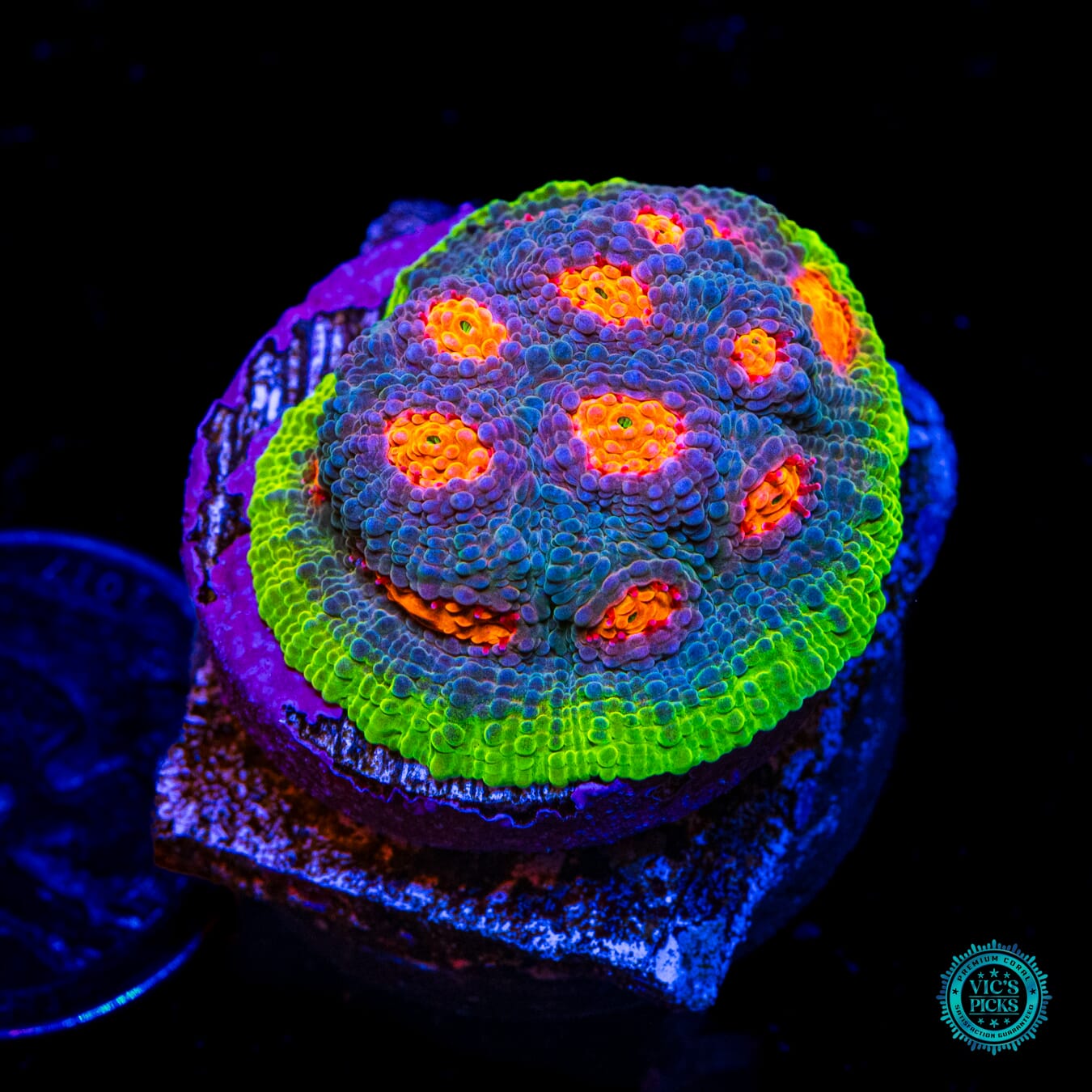 1.25" in diameter, WYSIWYG and fully aquacultured by WWC! Jason has been growing out this insane Crazy Fox chalice for over 10 years now. The glowing orange eyes, neon green rim make for an unmistakenably gorgeous chalice!