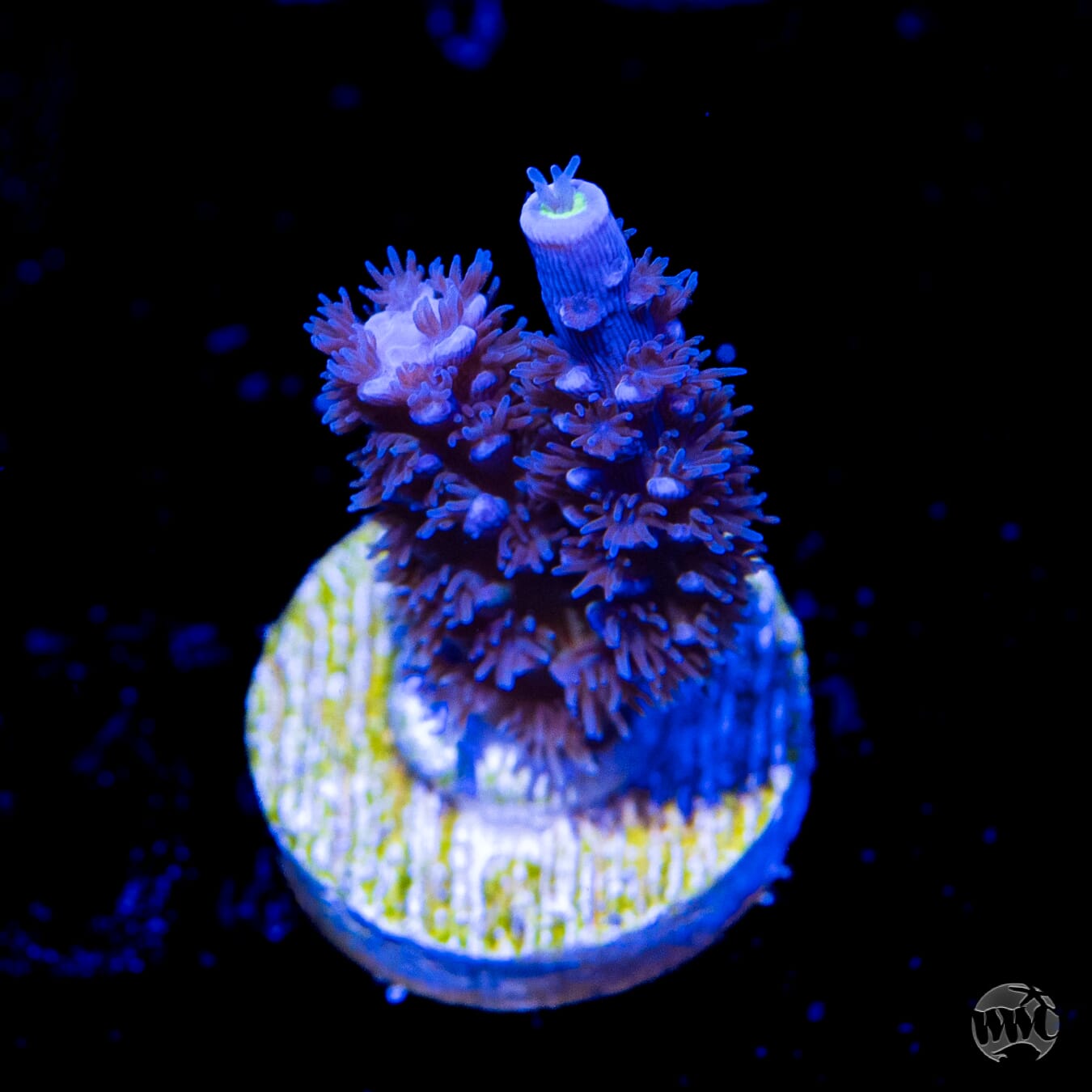 The Papa Smurf Acropora is a bold blue beauty with attitude. Featuring a deep, powdery blue base with icy sky-blue tips and subtle lavender undertones, this coral delivers that classic Smurf-tone saturation that glows under actinic lighting. It's cool, clean, and full of vintage SPS charm.