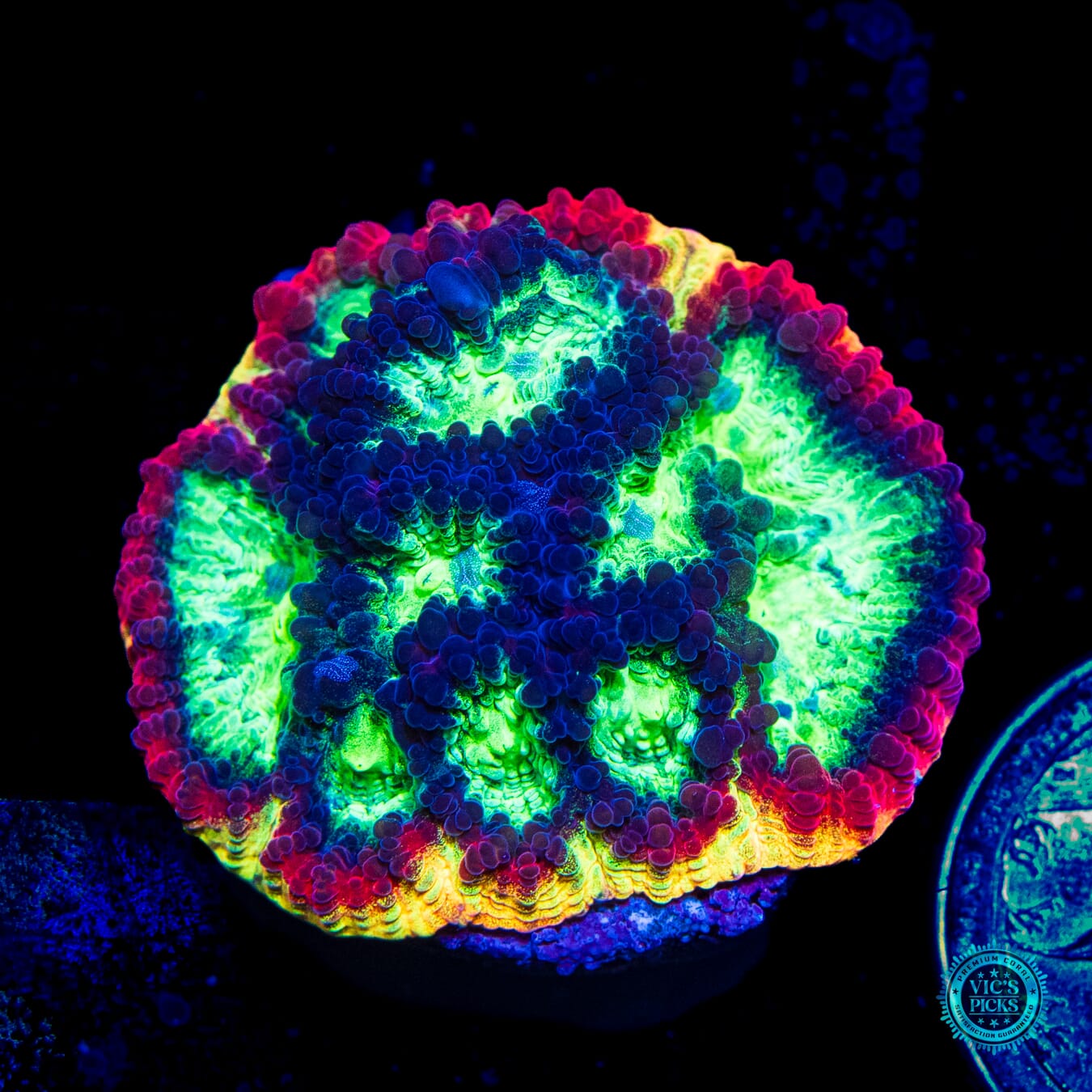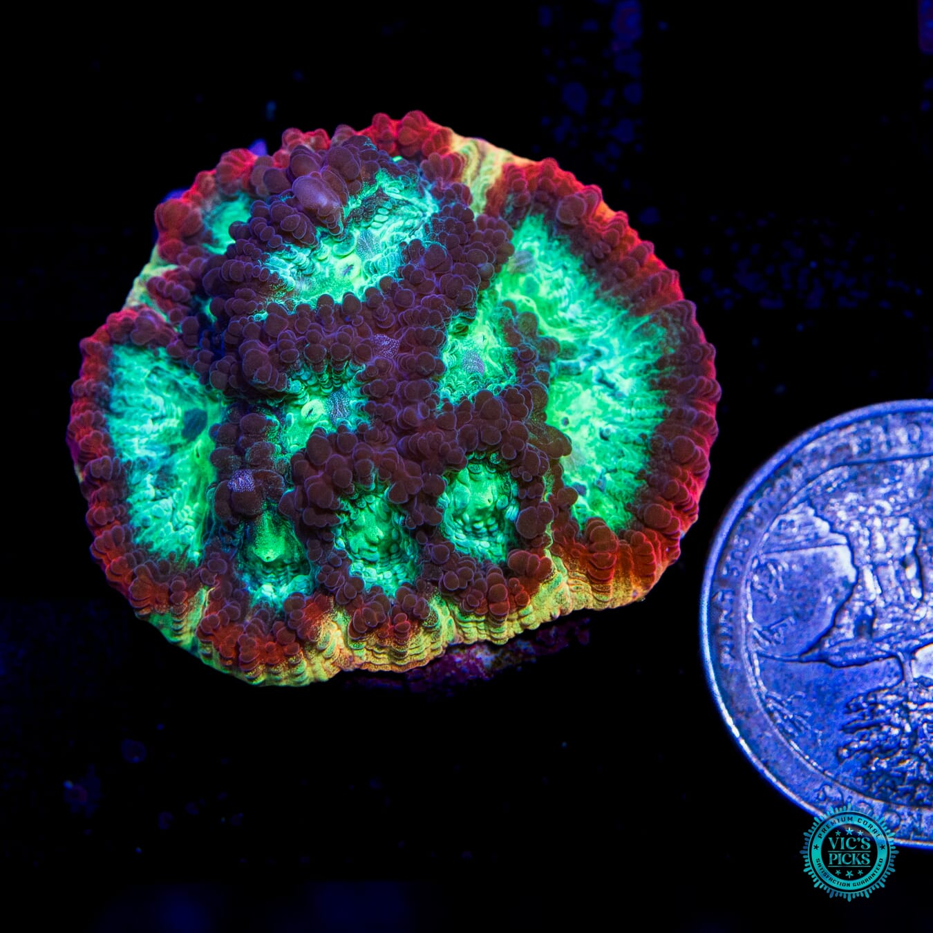 1.5" in diameter, WYSIWYG and fully aquacultured by WWC! Grown out by Jason for more than 5 years now, the rim on this Favia is wicked! And when its fully fluffed out and happy you can see the full expanse of it rainbow rim. It's that nice!