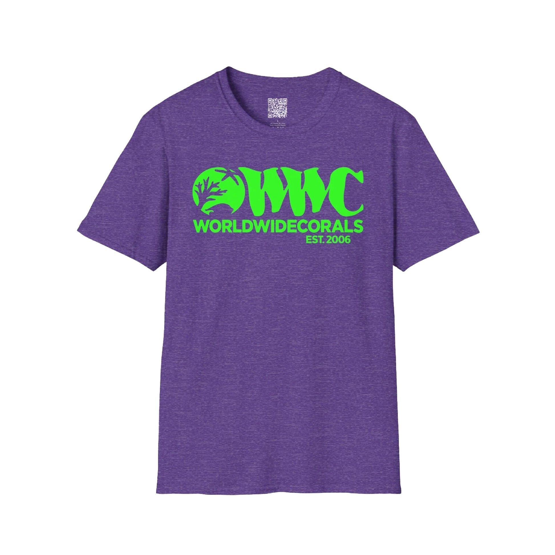 World Wide Corals presents our new Heather Purple w/ Neon Green Ink T-Shirt