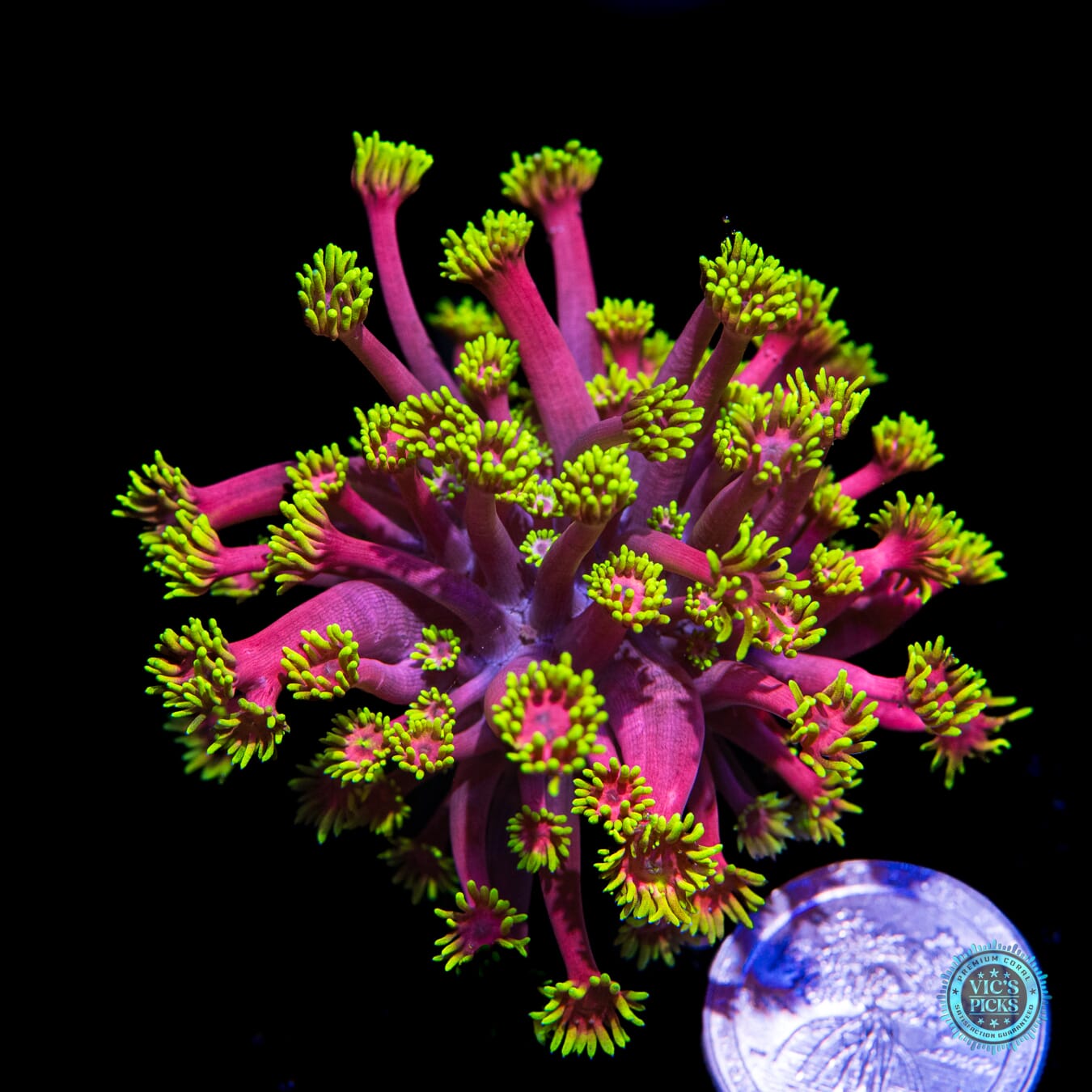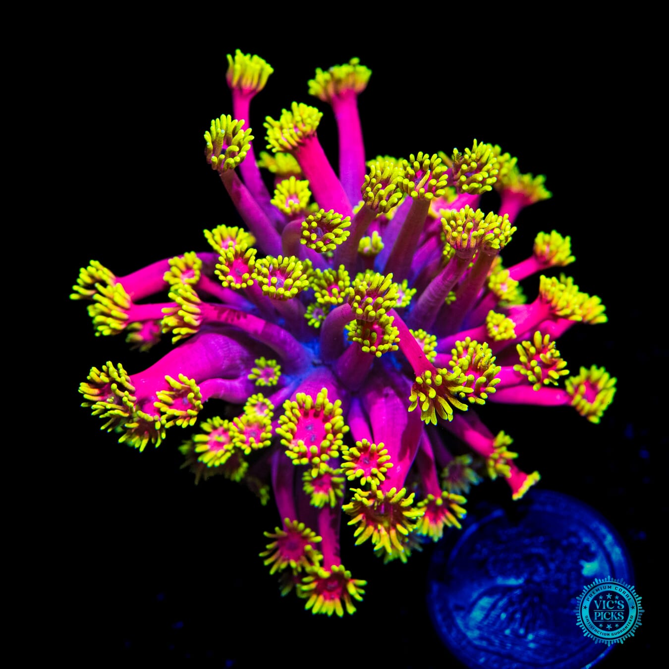 3" WYSIWYG and fully aquacultured by WWC! This is probably the hottest Goniopora in our collection. It is INCREDIBLE! It was originally growing out at our Winter Park store for around 3 years and now we have a few colonies scattered around the superstore where we can frag those colonies from time to time. Goni's don't grow very fast, so you can imagine, you won't be seeing very many of these each year. The NEON yellow tips and deep pink tentacles are freaking insane! Don't let FOMO rule over you!